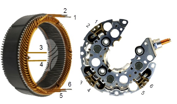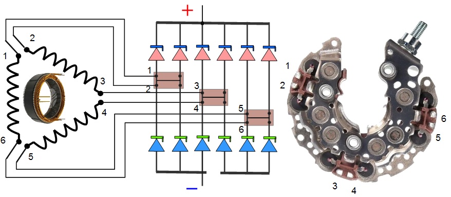 Клеммы на диодном мосте выполнены парами, которые соединяются внутренними мостиками, так, что выводы обмоток, припаянные к этим клеммам, становятся одной точкой, и получается соединение в треугольник.