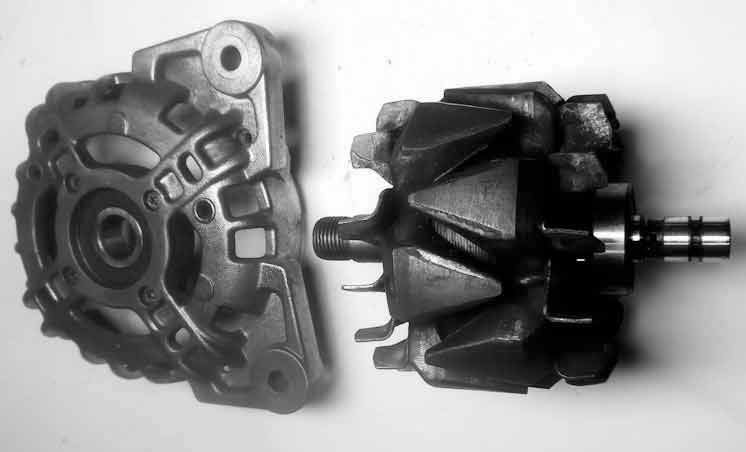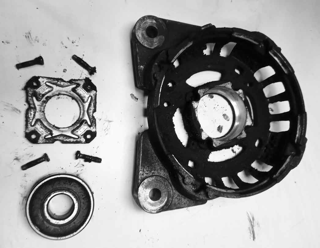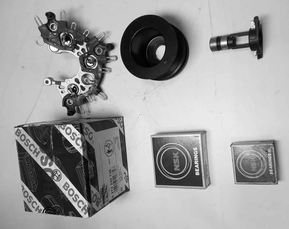 12. Старые и новые детали генератора: диодный мост, регулятор напряжения, кольца ротора, подшипники.