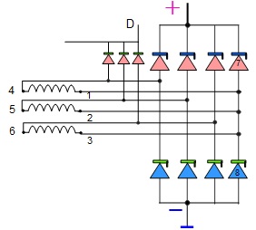 Сатор имеет 6 выводов, которые сгруппированы так, как показано на рисунке. Точки 1,2,3 диодный мост объединяет в одну точку, а точки 4,5,6 являются выводами фаз. так обмотки соединяются в звезду.