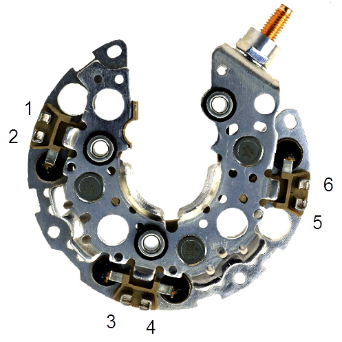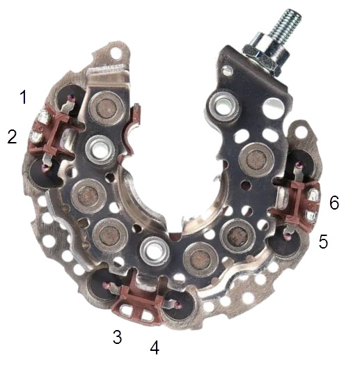 Для генераторов мощностью 120 -150А применяются диодное мосты на 12 диодов. Для генераторов меньшей мощности применяются на шесть диодов (реально 7 диодов,).