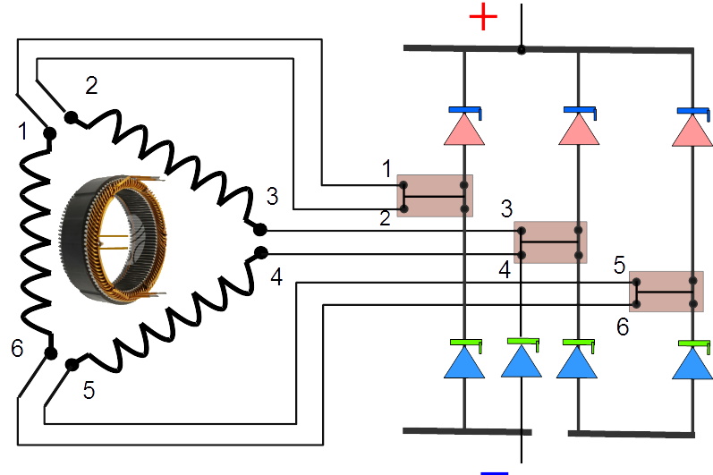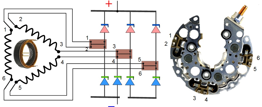 Клеммы на диодном мосте выполнены парами, которые соединяются внутренними мостиками, так, что выводы обмоток, припаянные к этим клеммам, становятся одной точкой, и получается соединение в треугольник.