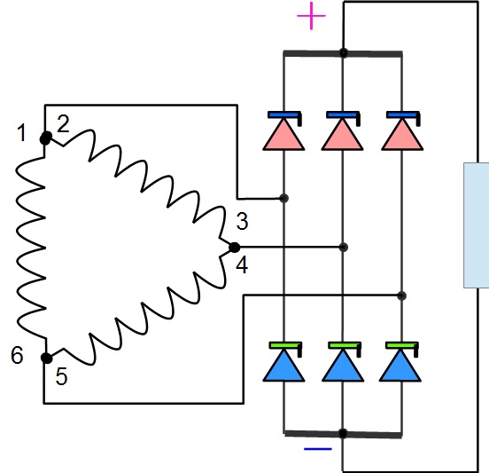 Диодный мост должен соединить точки обмоток 1и 2, 3 и 4, 5 и 6.