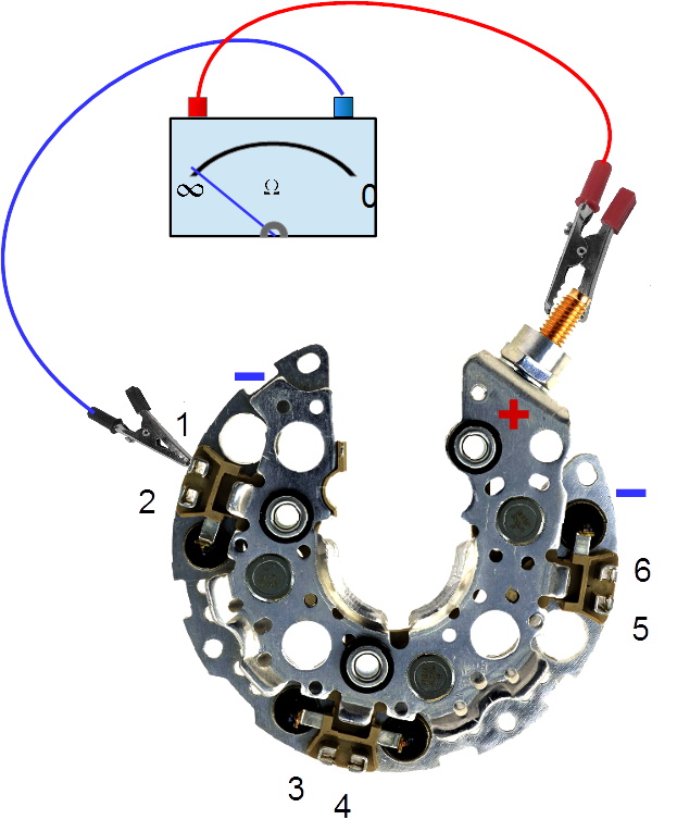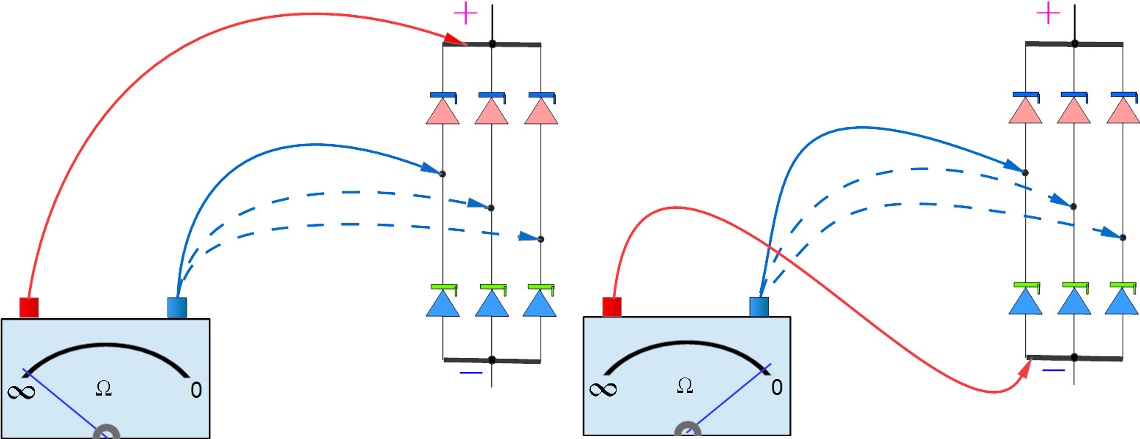 Затем, также, по очереди проверяем диоды относительно минусовой шины. Если диодов 12, то надо проделать 24 замера. На это уходит не более минуты.