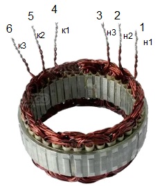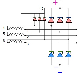 Сатор имеет 6 выводов, которые сгруппированы так, как показано на рисунке. Точки 1,2,3 диодный мост объединяет в одну точку, а точки 4,5,6 являются выводами фаз. так обмотки соединяются в звезду.