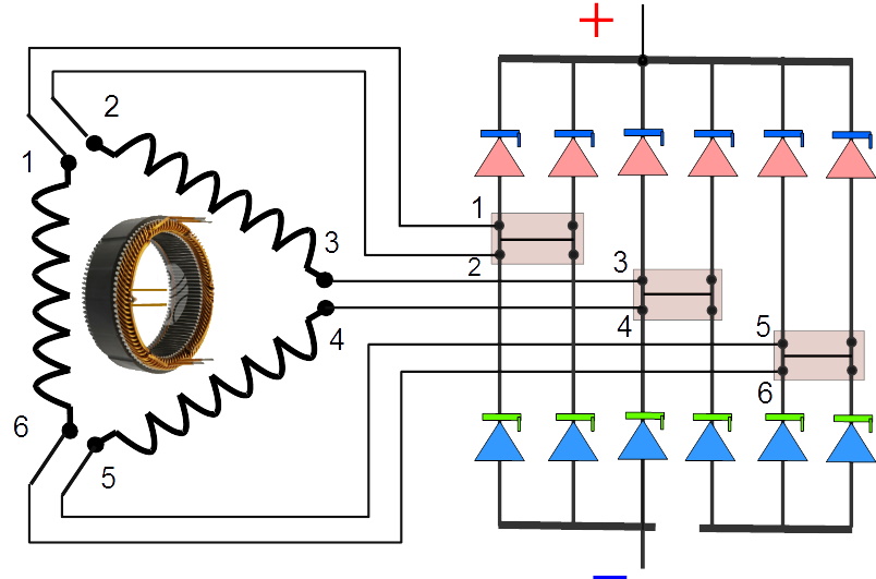 Клеммы на диодном мосте выполнены парами, которые соединяются внутренними мостиками, так, что выводы обмоток, припаянные к этим клеммам, становятся одной точкой, и получается соединение в треугольник.