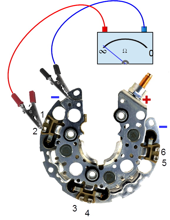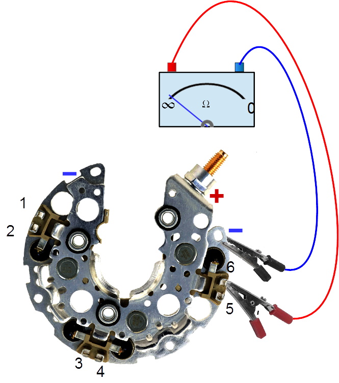 Затем, также, по очереди проверяем диоды относительно минусовой шины. Если диодов 12, то надо проделать 24 замера. На это уходит не более минуты.
